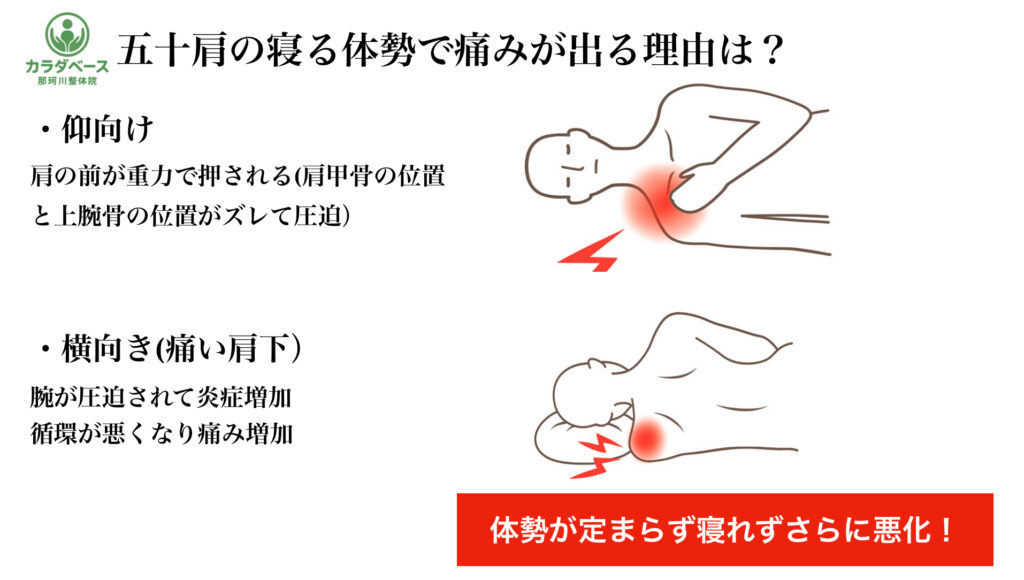 五十肩の方は、仰向けと五十肩を下にした横向きの姿勢で痛みが出ることが多いです💦