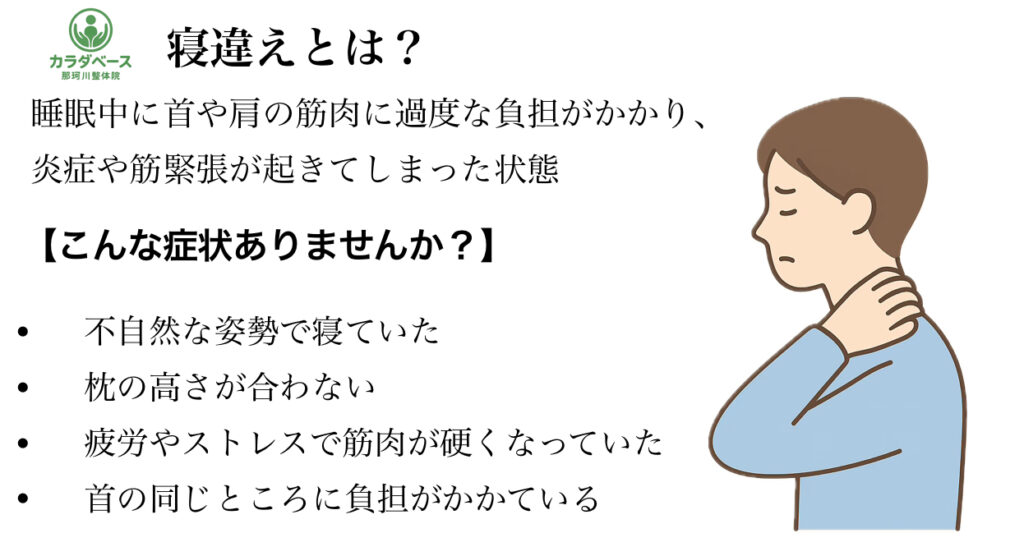 寝違えは、睡眠中に首や肩の筋肉に過度な負担がかかり、炎症や筋緊張が起きてしまった状態です。