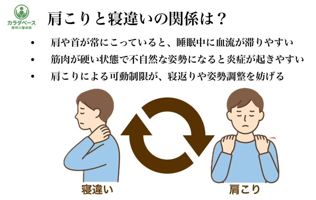 - 肩や首の筋肉が常にこっていると、睡眠中に血流が滞りやすくなる
