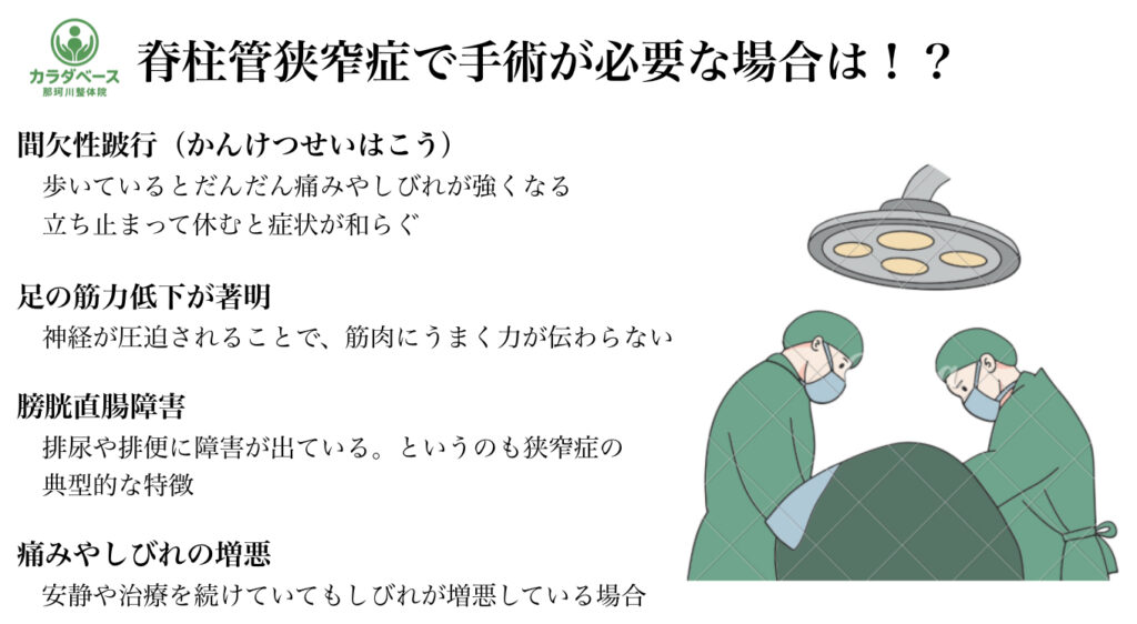 脊柱管狭窄症の手術は、必ずしもすぐに行うものではありません。医師が手術を勧めるケースは以下のような場合です。