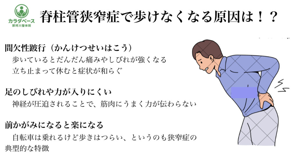 こうした悩みは、脊柱管狭窄症(せきちゅうかんきょうさくしょう)の代表的な症状です。