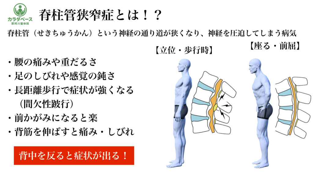 身体を曲げると楽になり、背中を反らすとしびれや痛みが出ることが特徴的です。