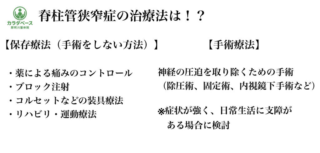 脊柱管狭窄症の治療は、大きく「保存療法」と「手術療法」に分けられます。