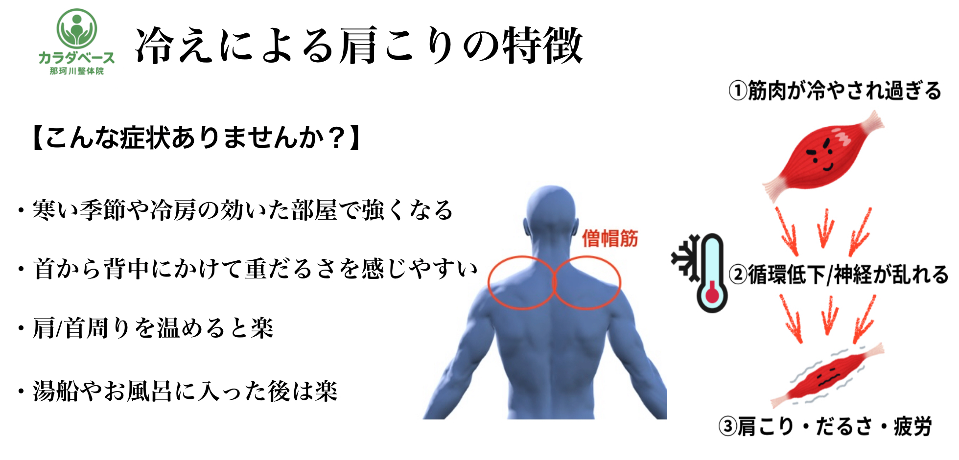 冷えると血管が収縮し、血流など循環が悪くなります。その結果、首や肩の筋肉に十分な酸素や栄養が届かず、疲労物質がたまりやすくなります。その結果痛みや肩こりを助長させます。